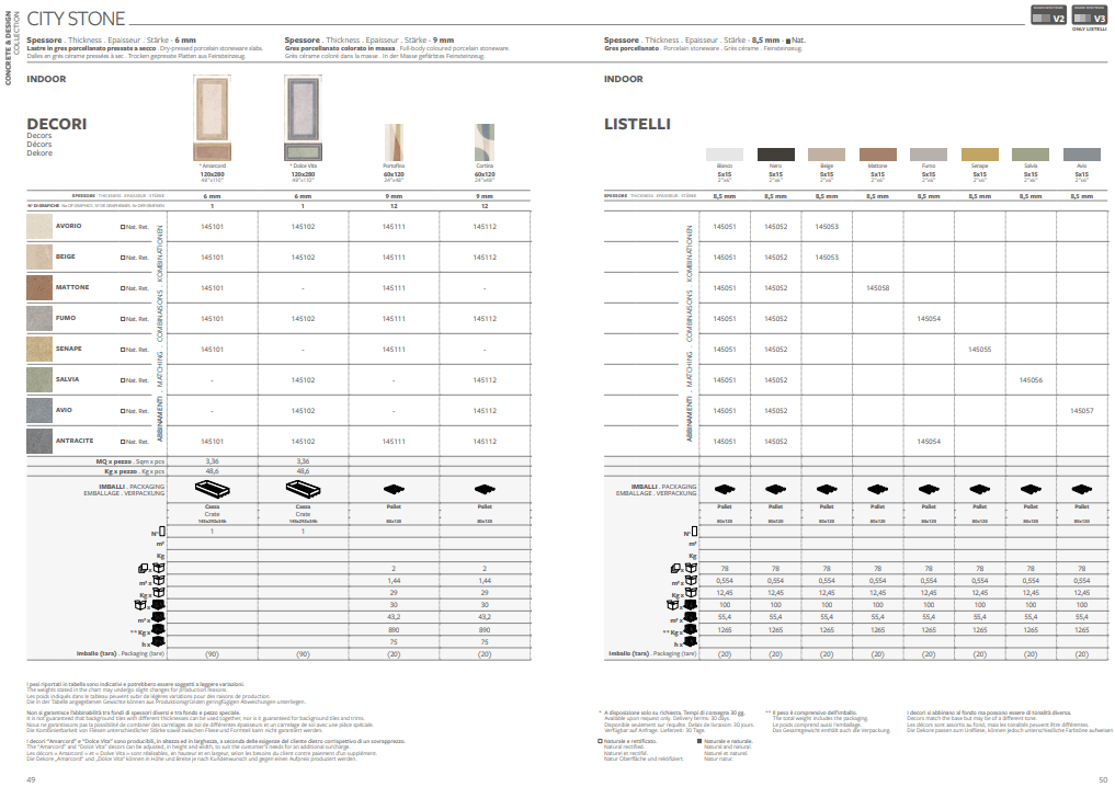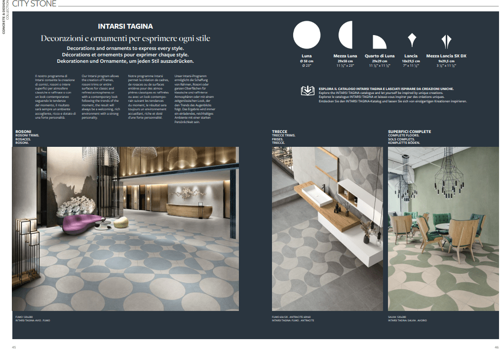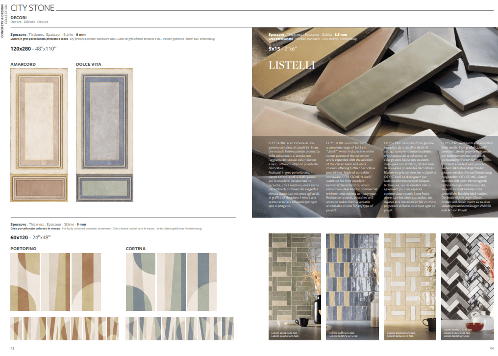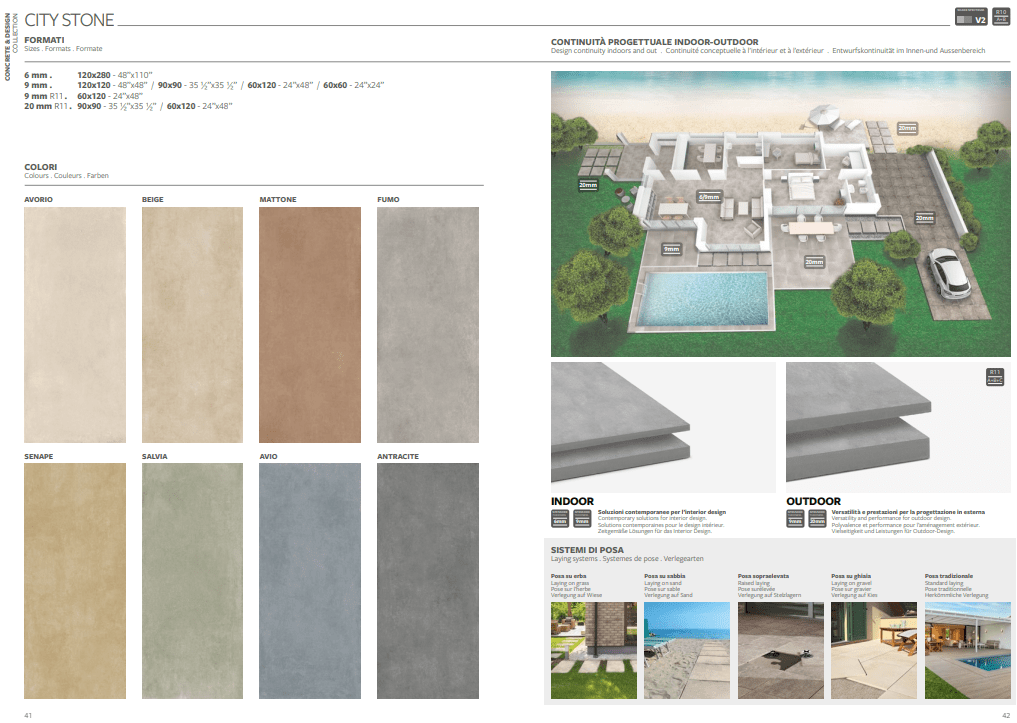 Le tonalità pastello delle pietre, come il Beige e l’Avorio, si fondono in perfetta sintonia con le palette cromatiche della città: Fumo, Antracite, Mattone, e accenti vibranti di Senape, Avio e Salvia.