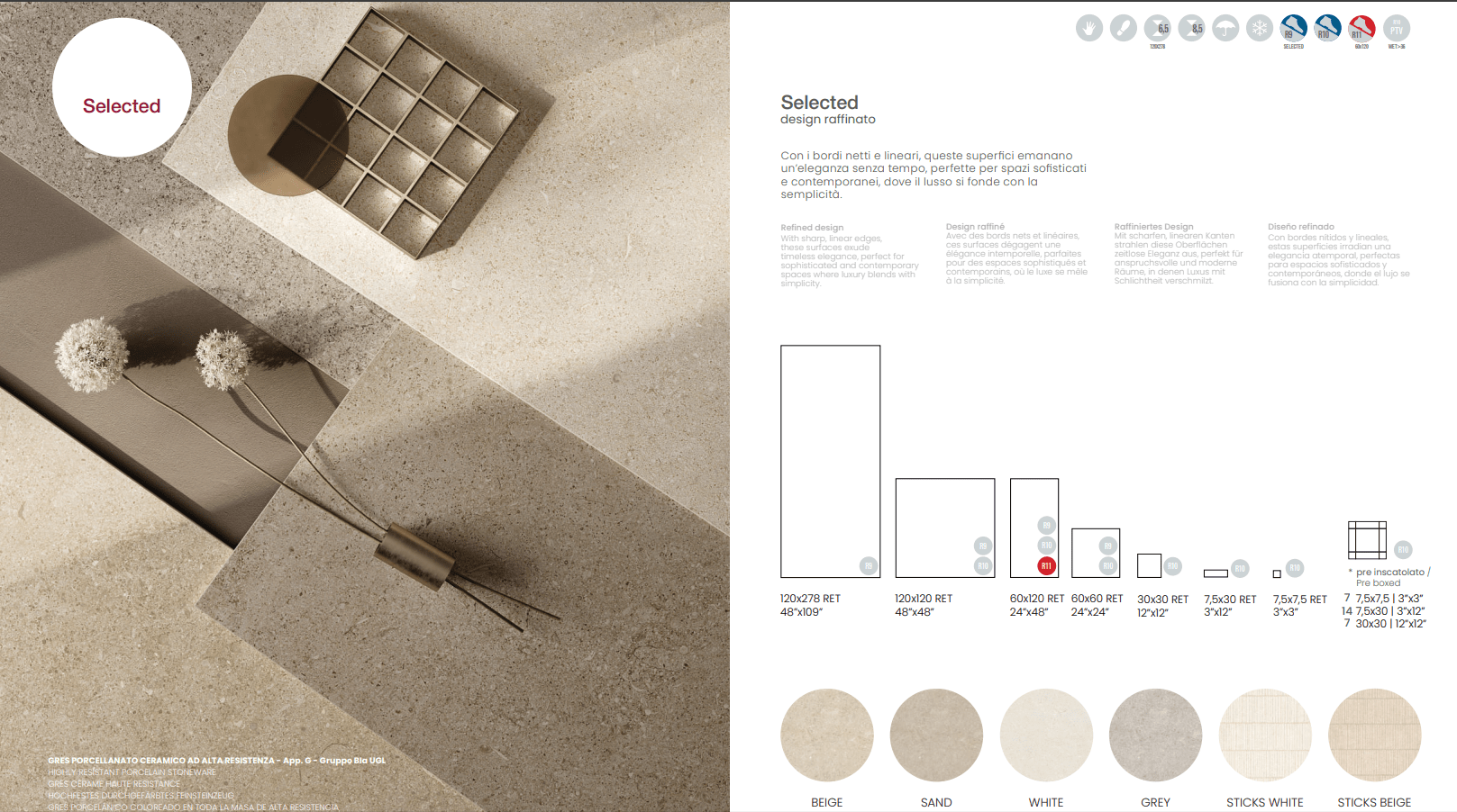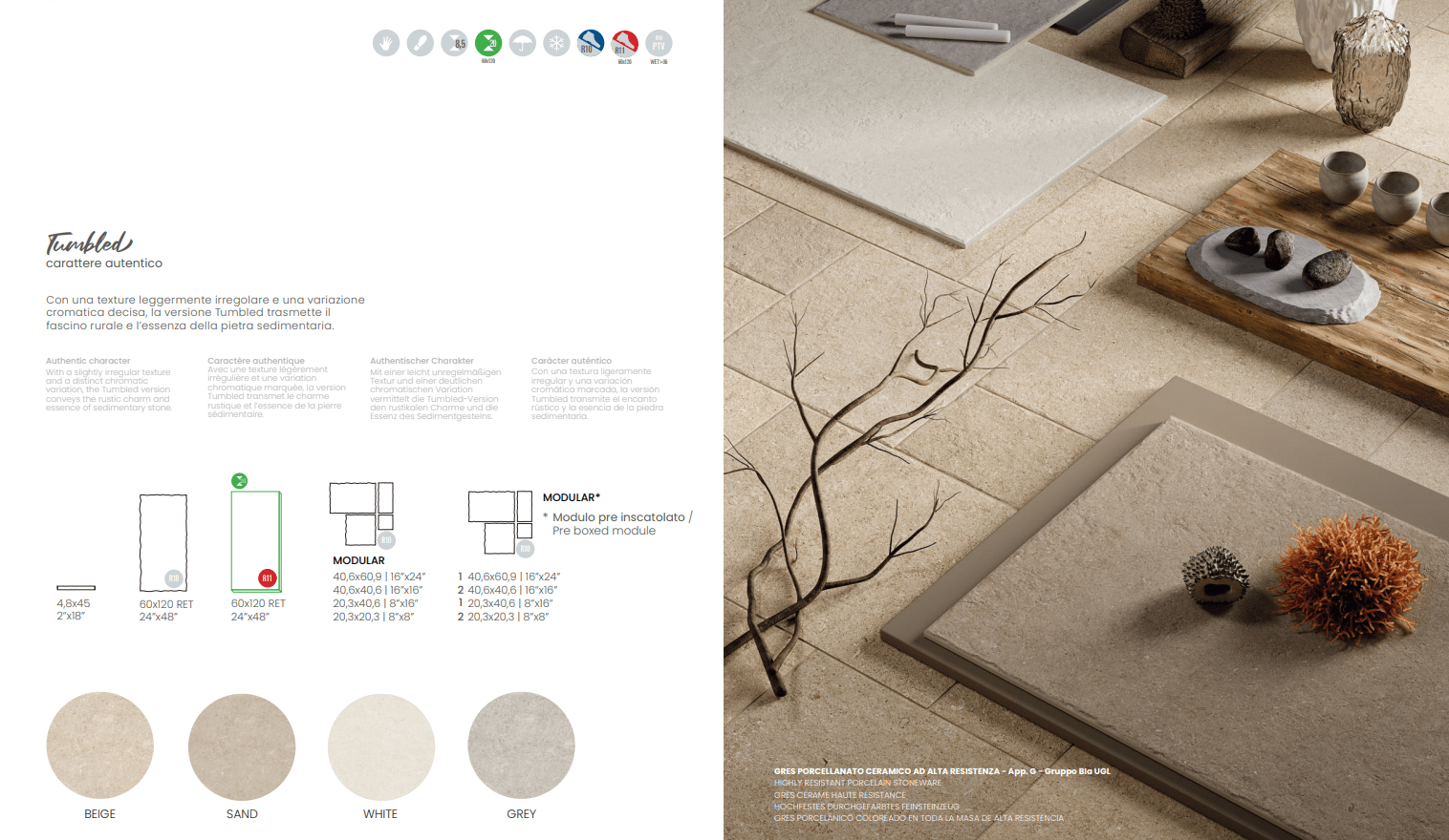 Gres porcellanato Sedimenti si sviluppa in quattro colorazioni e un decoro, dal formato lastra fino al piccolo 20×20, con finiture adatte ad ogni esigenza: Soft touch R9 per chi desidera una soluzione morbida e delicata, certificato R10* per ambienti tecnici e commerciali, R11 per un utilizzo trasversale per qualsiasi tipo di ambiente.